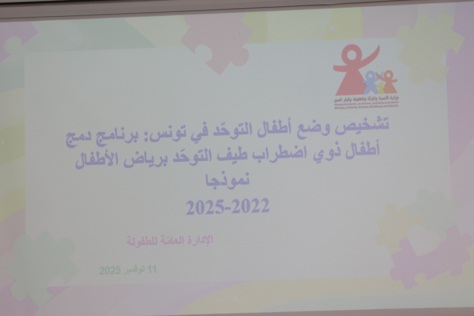 أكّدت وزيرة الأسرة والمرأة والطفولة وكبار السنّ أسماء الجابري، لدى افتتاحها صباح اليوم الثلاثاء 11-11-2025 أشغال ورشة الانطلاق في إعداد الخطة الوطنيّة لدمج الأطفال واليافعين من ذوي اضطراب طيف التوحّد، أنّ هذه المبادرة تأتي تنفيذًا لتوجيهات سيادة رئيس الجمهورية الذي يولي دائماً أهميّة قصوى لقضايا الدمج الاجتماعي وحقوق الأشخاص ذوي الإعاقة والفئات الهشّة وتكريس العدالة الاجتماعية والمساواة في الفرص بين جميع أبناء الوطن.