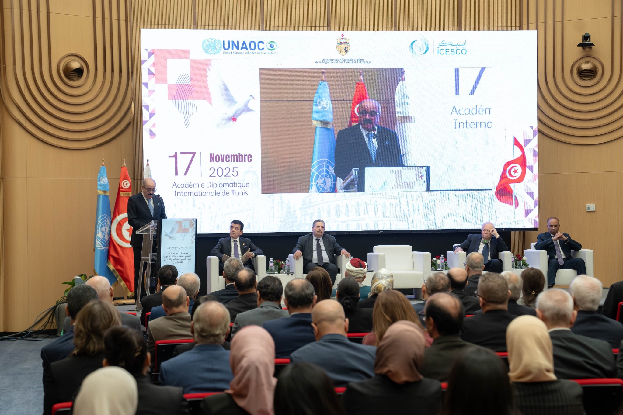 في إطار دعم الحوار بين الثقافات وتعزيز قيم التفاهم والتعايش بين الشعوب وتفعيل المبادرة التي أذن بها السيد رئيس الجمهورية الأستاذ قيس سعيد بوضع سنة 2025 تحت شعار تعزيز العمل متعدد الأطراف. احتضنت تونس اليوم 17 نوفمبر 2025 بمقر الأكاديمية الدبلوماسية الدولية بتونس ندوة دولية حول تفعيل دور تحالف الأمم المتحدة للحضارات في دعم السلم والأمن الدوليين، بمشاركة السيد وزير التربية رئيس اللجنة الوطنية للتربية والعلم والثقافة وسماحة الشيخ مفتي الجمهورية التونسية وعدد من سفراء الدول الأجنبية المعتمدة ببلادنا ونخبة من الخبراء الوطنيين وممثلي المنظمات الدولية والإقليمية.