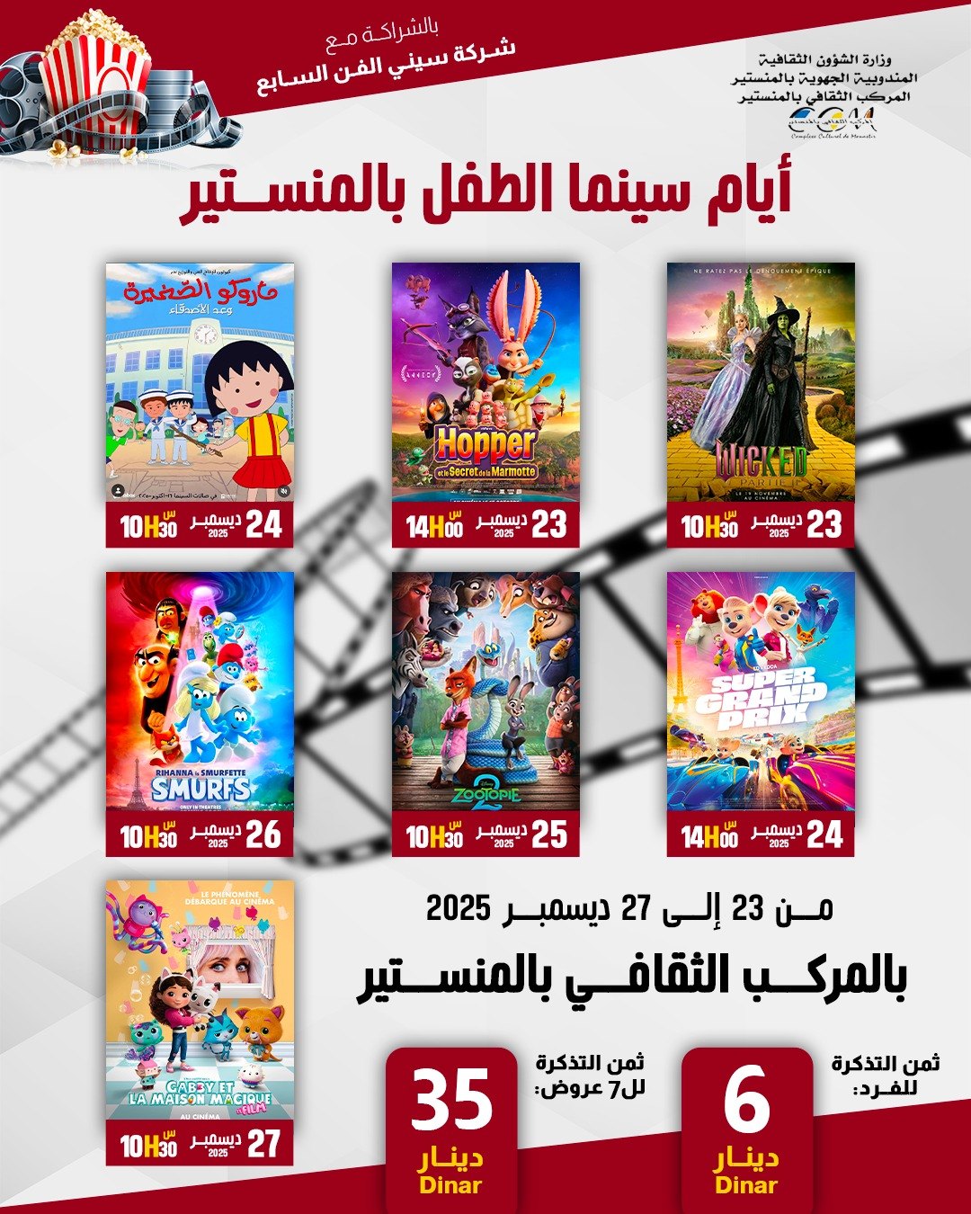 تحت إشراف المندوبية الجهوية للشؤون الثقافية بالمنستير وفي إطار البرنامج الوطني تونس مدن الفنون ينظم المركب الثقافي بالمنستير بالتعاون مع شركة الفنّ السابع تظاهرة '' أيام سينما الطفل بالمنستير '' تندرج ضمن المسلك السينمائي من 23 إلى27 ديسمبر 2025 بالمركب الثقافي بالمنستير