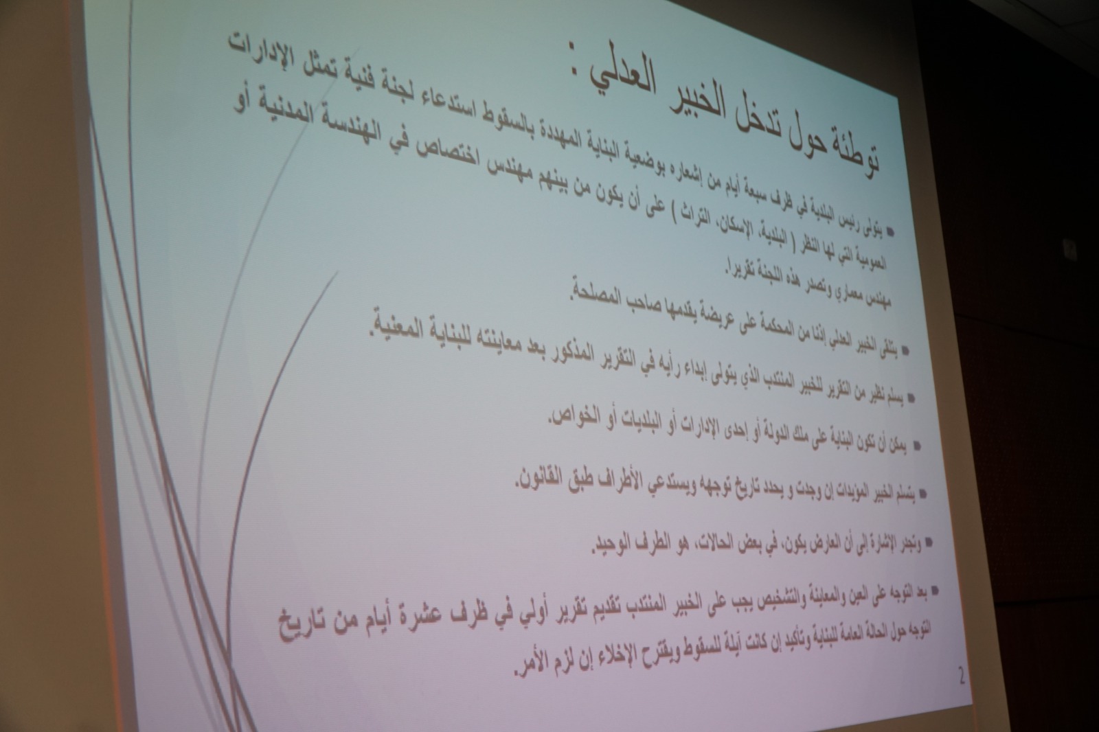 وقدّم كل من الخبيرين العدليين السيدان الاسعد الشابي وأمير التركي الجانب الفني في تحديد المباني المهددة بالسقوط وطرق فحص المباني الأثرية وتقدير خطورة بعضها.