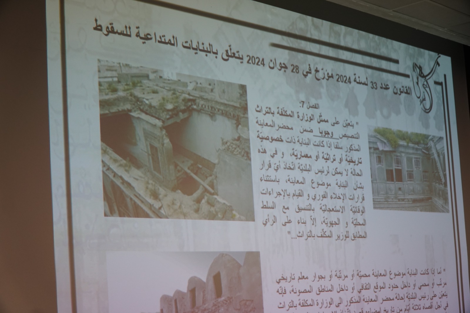 وقد بلغ عدد البنايات المعنية بالمعاينة وذات الصبغة التراثية حسب القانون 33 لسنة 2024 والمتعلق بالبنايات المتداعية للسقوط بلغ 450 بناية، وقد تطرّق ممثّل وزارة التجهيز السيد منصف السوداني من خلال مداخلته حول تطبيق القانون عدد 33 لسنة 2024 الى مختلف أوجه التدخّل وحدوده.