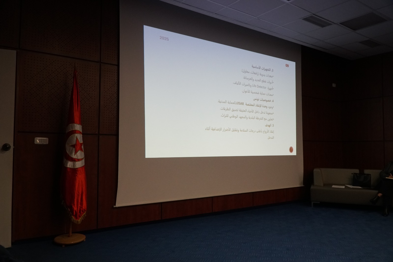 من جهته أكّد الرائد بلال بوسعيدي في مداخلته “دور الحماية المدنية في حماية المباني الأثرية والتاريخية المهدّدة بالسقوط على أهمية تضافر الجهود بين الحماية المدنية والجهات المختصة لمعاينة هذه المباني وتنفيذ تدخلات لصالحها، وتتولّى الحماية المدنية التنسيق مع وزارة الشؤون الثقافية لتحديد القيمة التراثية للمبنى والإشراف على الترميم الى جانب مكاتب الدراسات والبلديات والشرطة البلدية ووزارة التجهيز.
